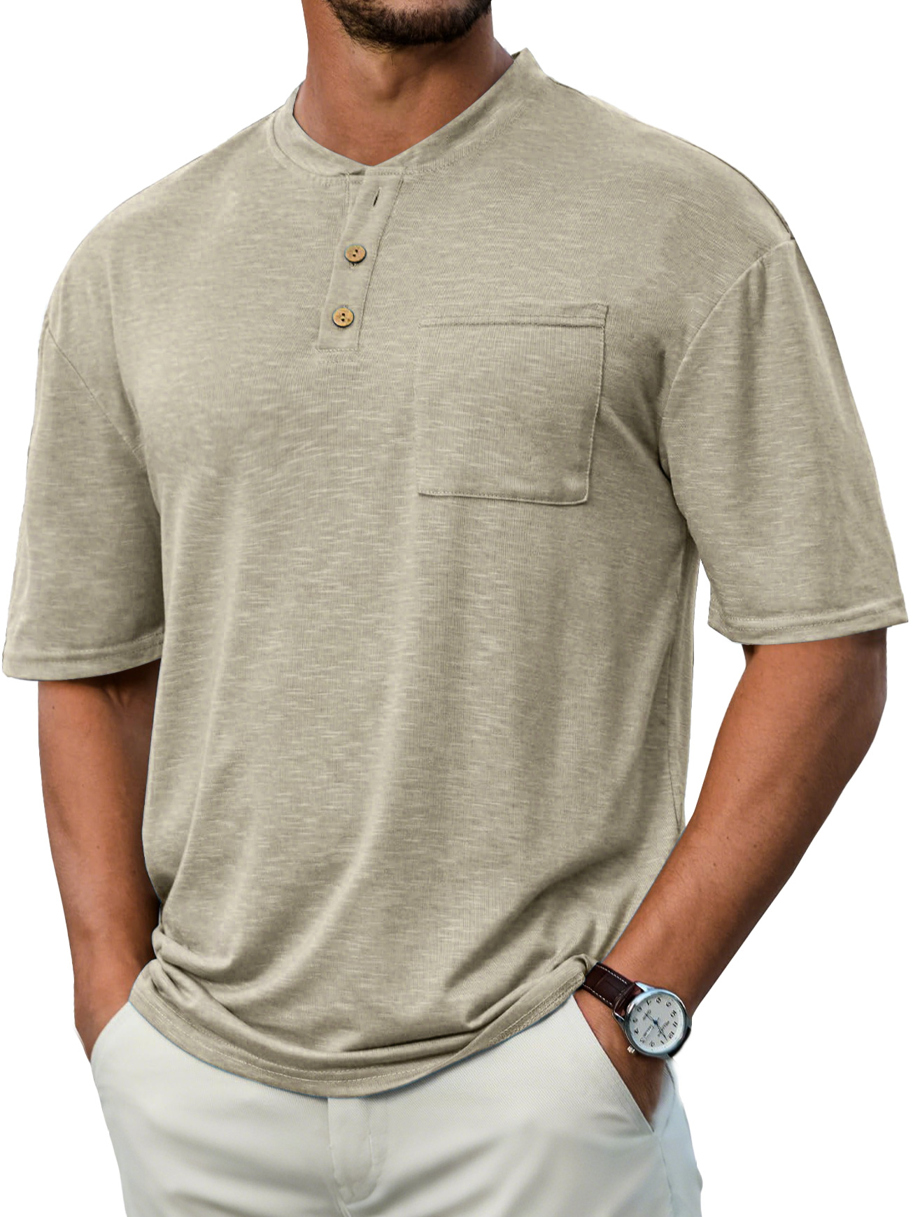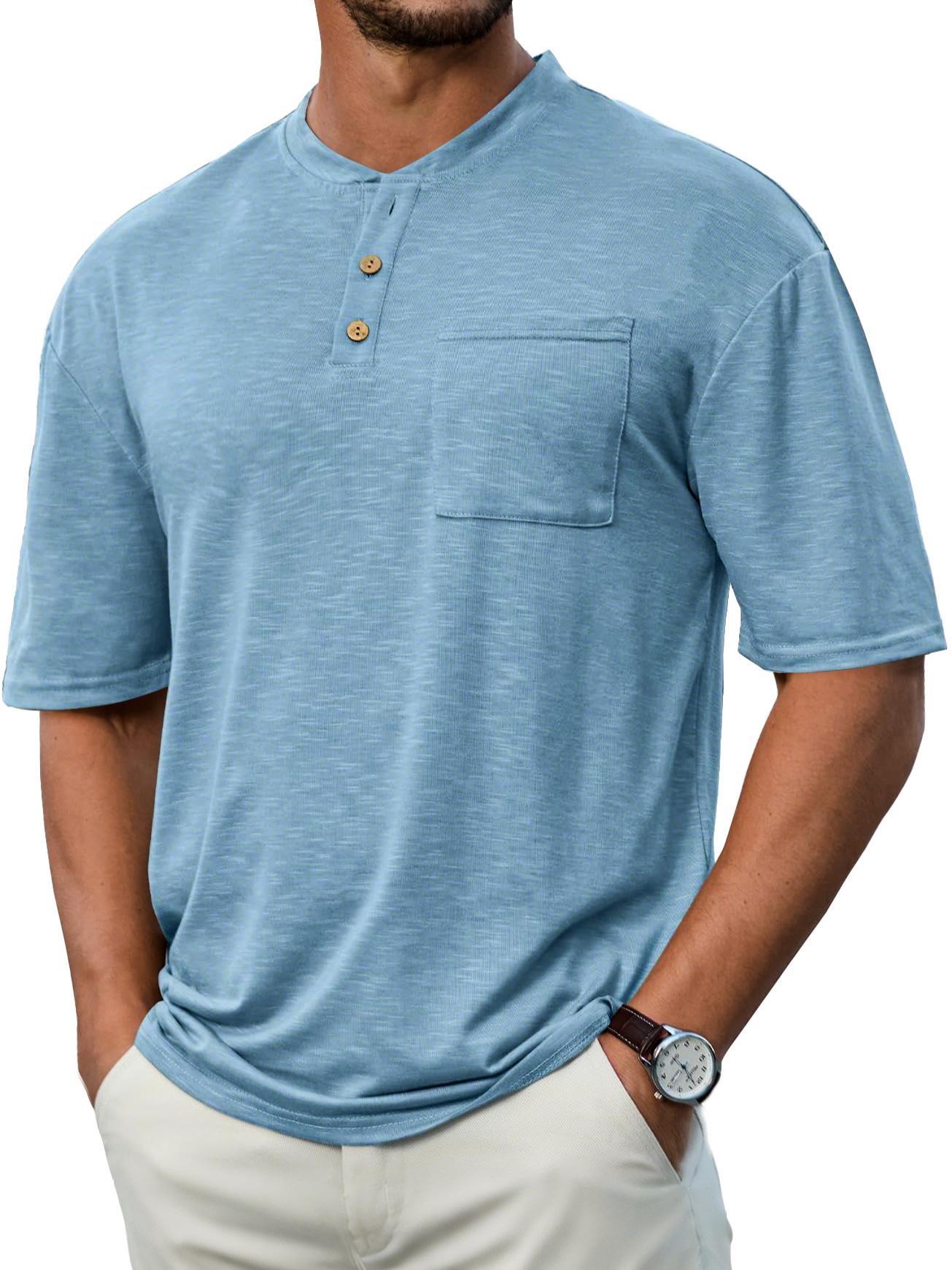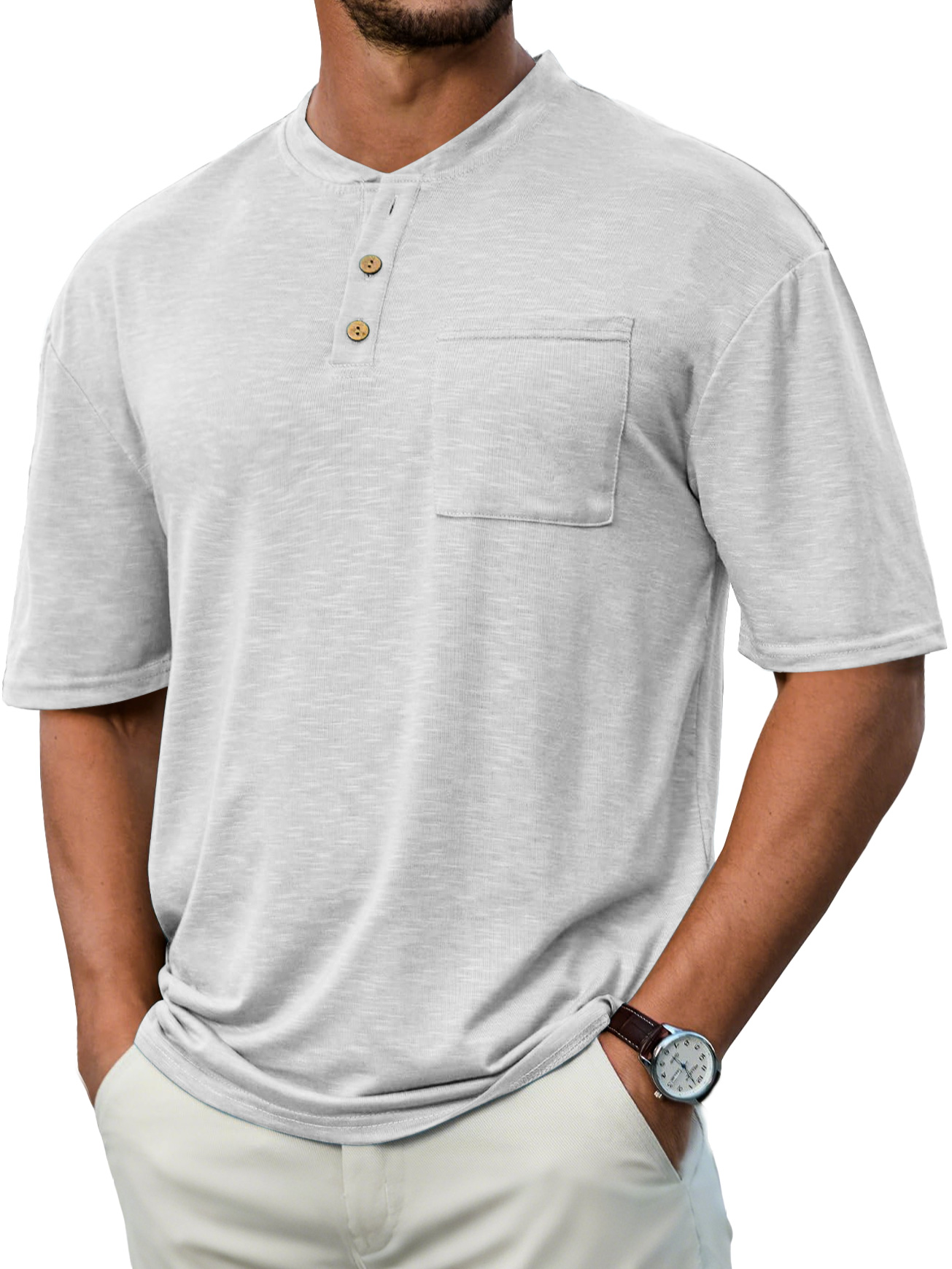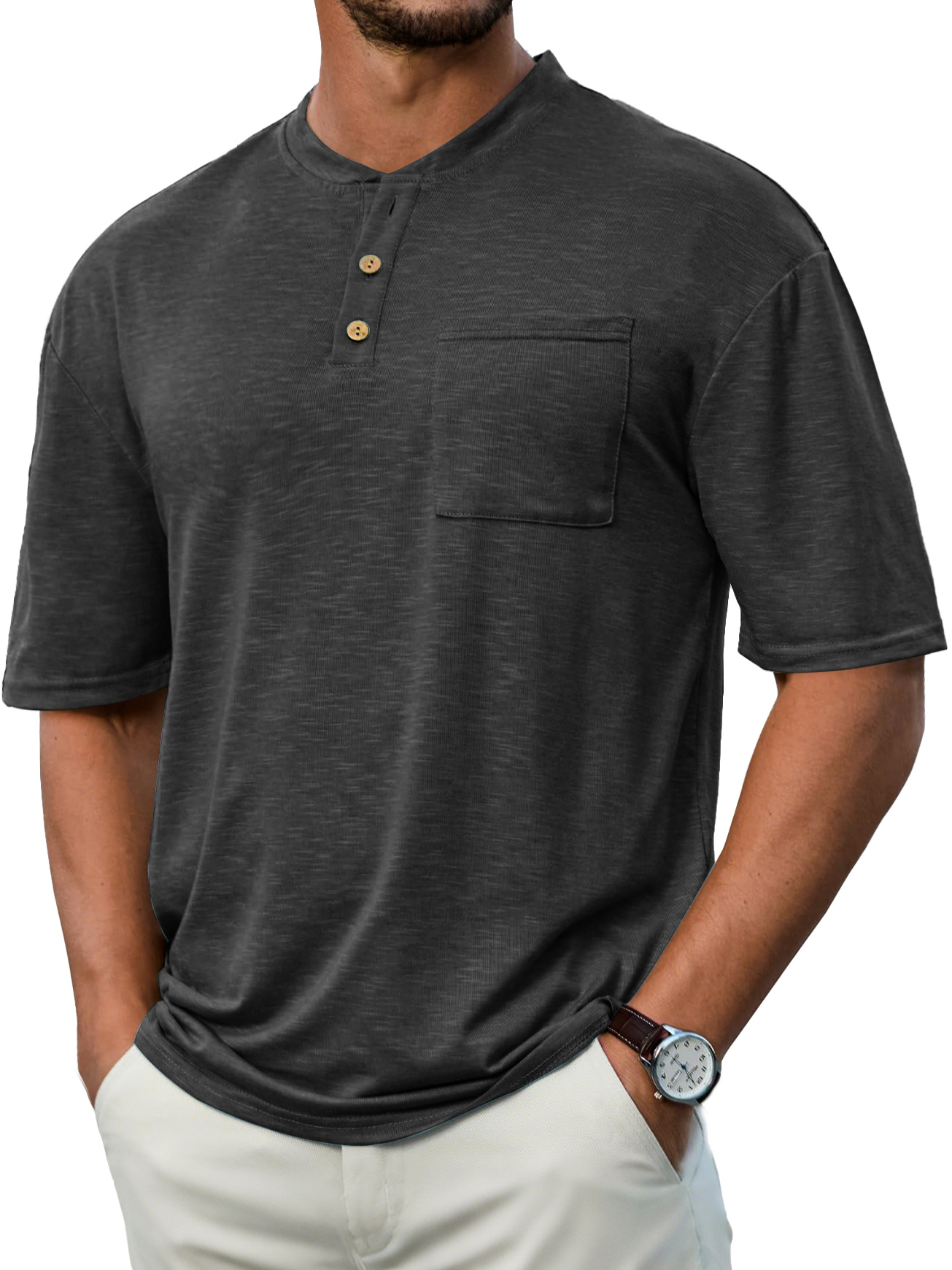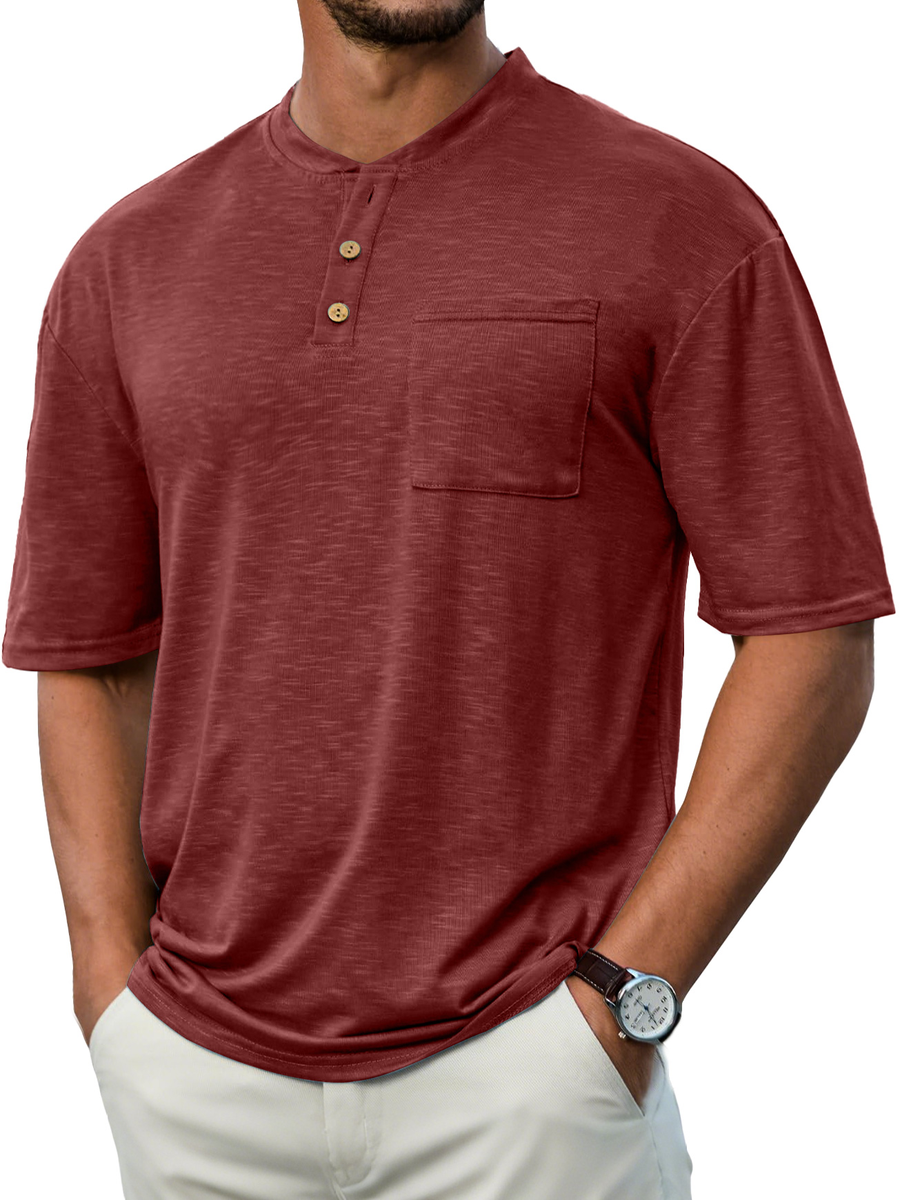 Men's Everyday Casual Stand Collar Pocket Comfort Short Sleeve Henley Shirt
